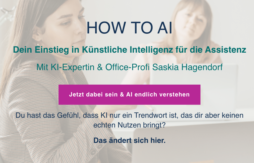 Wenn Du nach diesem Beitrag Lust bekommen hast, KI in Deinem Arbeitsalltag wirklich praktisch auszuprobieren, dann ist das Webinar „How to AI – Dein Einstieg in die Welt der Künstlichen Intelligenz“ am 20. November genau das Richtige für Dich.